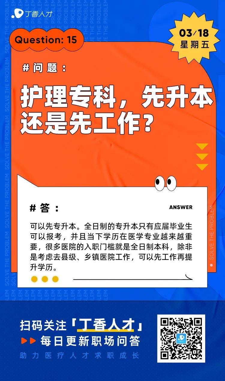 职场 | 护理专科,先升本还是先工作? 来源:丁香人才公众号 日期:2022-06-17 3 月 1 日起,丁香人才将会每日更新职场问答,助力医疗人才求职成长。 本栏目所有问题均来源于 留言区高赞评论 , 如果你在求职中遇到任何问题,欢迎留言提问, 也可以进群提问。 你的每个问题,这里都有答案。 上一篇:四川 | 成都市第四人民医院招聘公告 下一篇:本科即可领取一次性安家费 5 万元 | 公立三级综合医院招聘