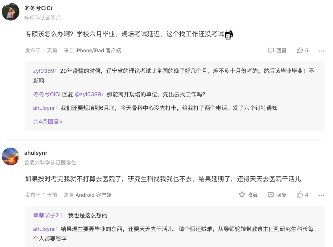 部分网友已经开始担心数年后的主治报名问题,毕竟如今的主治报名需要取得规培证后 2 年的工作经历,如果因为延期的这段时间影响未来的时限计算和报名,耽误 1 年的晋升,未来可能会有无数个夜晚扼腕叹息。