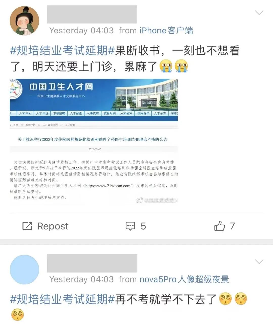 考虑到 2022 届结业的规培考生在去年九月就已收到明确通知,一年有且仅有一次考试,如今在紧张的备考之余再添变数,让参加考试的学子更感压力。