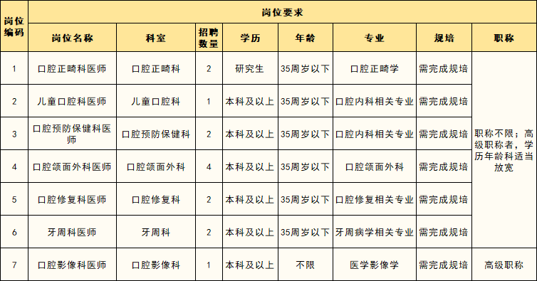 医院致力于建设成为医疗技术精湛、医疗设施先进、医院管理规范、医德医风良好的富有影响力和竞争力的三级口腔专科医院,正处于建设发展的关键期,现急需引进各类高层次高水平人才。