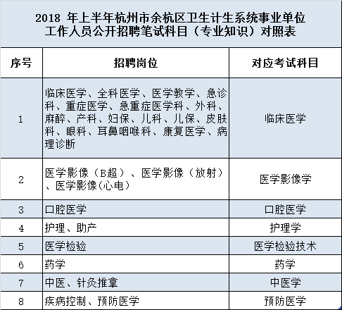 2、考试科目为《专业知识》一科。具体岗位对应的《专业知识》科目,详见以下《2018 年杭州市余杭区卫生计生系统事业单位工作人员公开招聘笔试科目(专业知识)对照表》。