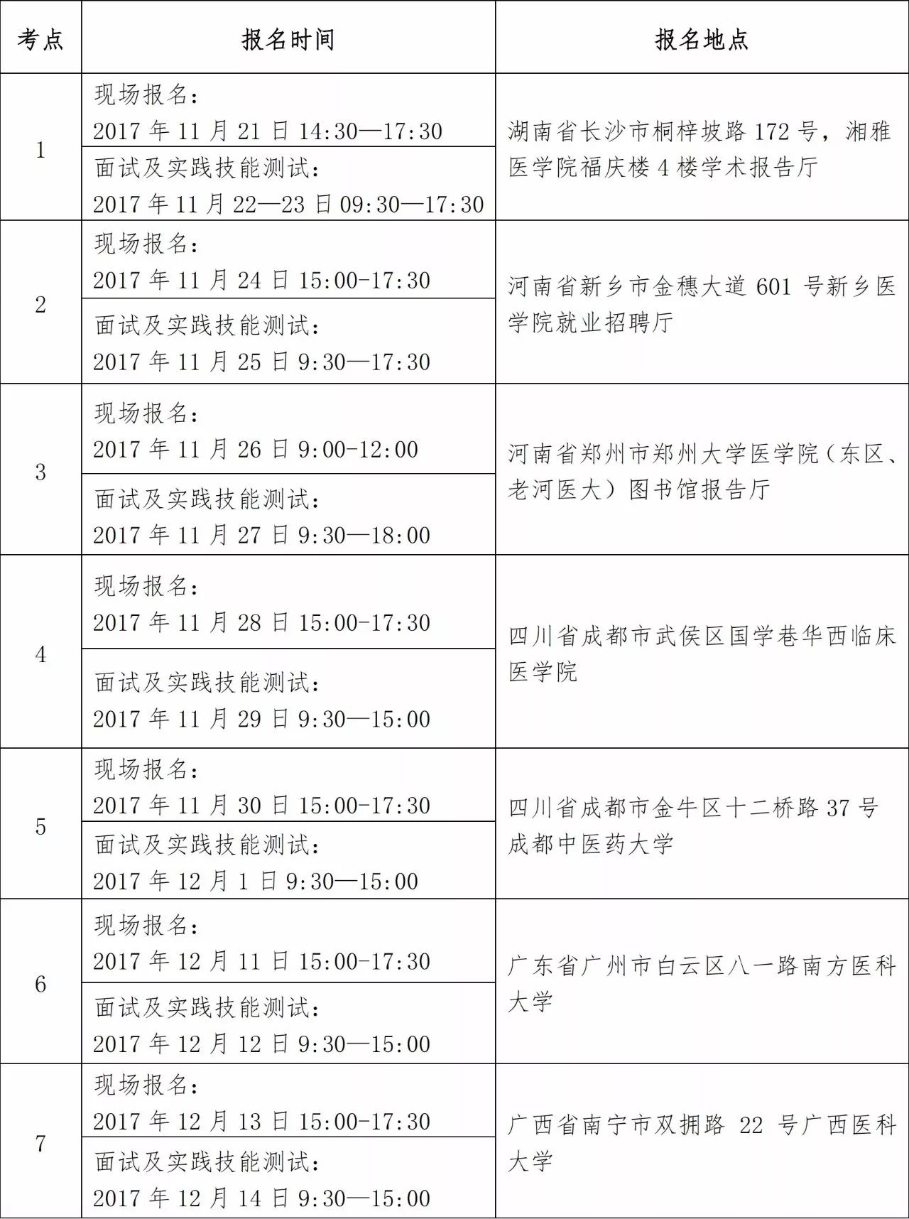 考点依次为:「中南大学湘雅医学院(考点 1)、 河南新乡医学院(考点 2)、郑州大学医学院(考点 3)、四川大学华西医学中心(考点 4)、成都中医药大学(考点 5)、南方医科大学(考点 6)、广西医科大学(考点 7)」。