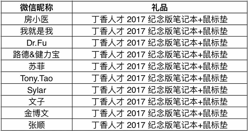 按照活动规则,留言点赞量前十的朋友讲获得丁香人才准备的礼品: