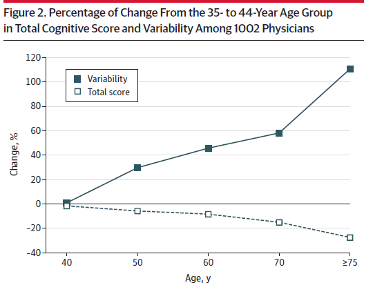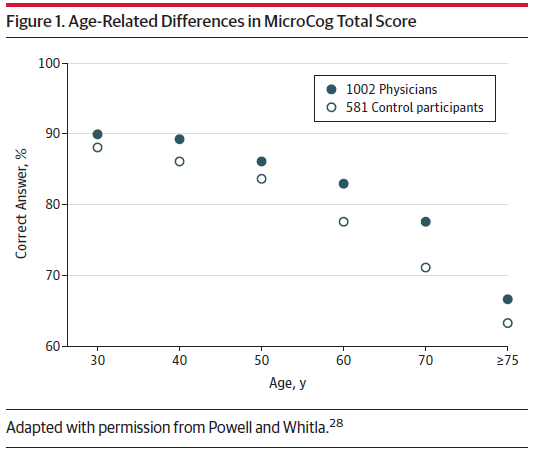 而最新来自 JAMA (美国医学会杂志)一项综述分析结果显示,75 岁以上医生在进行认识能力测试,平均比 40 岁医生的评分低 20% 以上。而涉及到临床操作及外科手术领域,年龄导致的差距会进一步拉大。