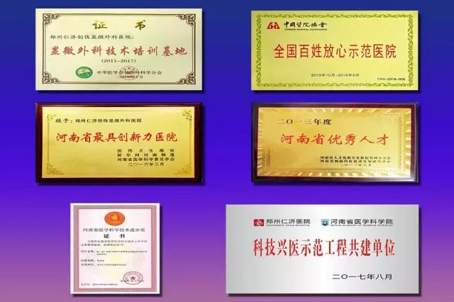 医院荣获全国百姓放心示范医院、全国诚信民营医院、河南省「显微外科」重点学科单位。被授予中国修复重建临床技术推广基地,中华医学会显微外科技术培训基地、中华医学会显微外科分会委员单位、中华医学会手外科分会委员单位、中华医学会骨科分会委员单位、中国医师协会手外科分会委员单位、SICOT 国际矫形与创伤外科学会委员单位、亚太重建显微外科联盟中国部委员单位、中国非公立医疗机构协会医院管理分会委员单位等。