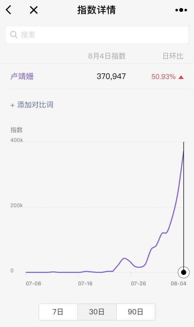 这是微信指数关于「卢靖姗」的搜索指数变化。7 月 6 日 - 8 月初,微信指数从400 飙升至 370,947,整整增加了 927 倍。卢靖姗本人也在微博发文感谢能有机会出演该电影,庆祝微博粉丝突破 20 万。