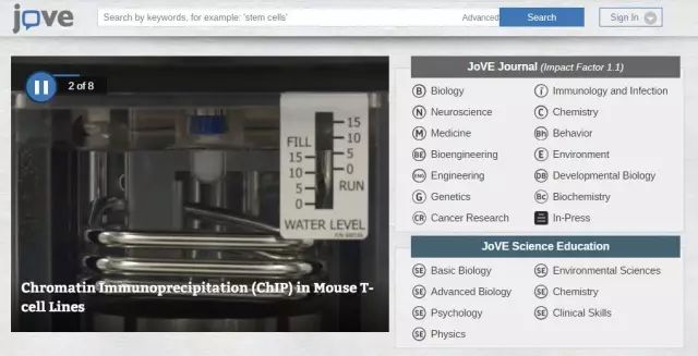 JoVE 全称 Journal of Visualized Experiments,该网站是专门收集实验操作和视频的学术网站。觉得看 Protocol 很枯燥的同学,可以考虑看看这个。