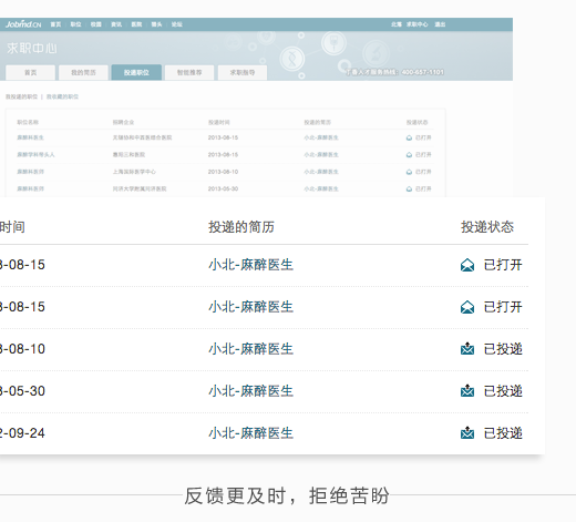 “投递了这么多简历,不知道HR有没有看到?”,“石沉大海,了无音讯!”,“如果被拒绝,请告诉我,让我死心!”……这些都是大家咬牙切齿的声音。求职最理想的过程是投递简历后,立马得到电话通知,成功的话就直接进入面试。但,现实中99%的剧情都不是这样进行的。所以为了让求职者直观看到投递的情况,我们增加了「已投递」、「已打开」、「已停止」的状态。