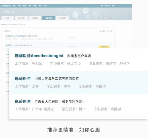 根据求职者的浏览行为、求职意向等因素推荐匹配职位,一直是被认为的王牌功能,却因种种原因在求职中心没有一席之地。这次我们将他重新打扮,重新展现出来,靠不靠谱,还得大家说得算。