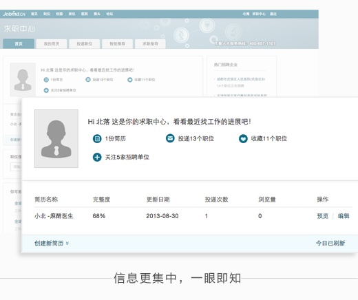拥有几份简历、投递过几个职位、收藏了哪些职位、关注哪些招聘企业、简历被看过几次、有哪些企业浏览过等等,都是求职者关心的信息,我们将它们都合理的摆放在首页,一眼即知。