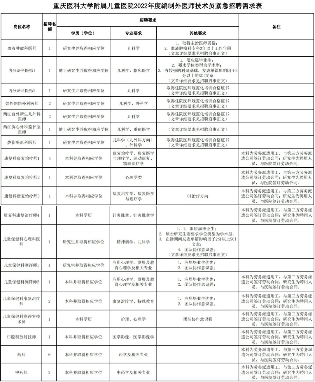 >>重庆医科大学附属儿童医院招聘岗位及要求