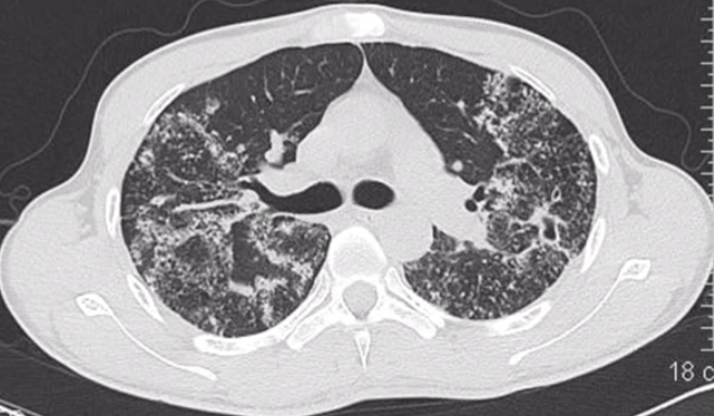 结节病中的反晕征是许多小结节组成的。在反晕征和微小结节同时存在时,需要考虑结节病的可能。本病例即结节病,CT 表现为反晕征、多发结节,在激素治疗后好转。