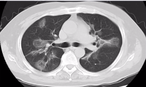 以反晕征为主要表现的肺结核患者,多为年轻患者,病情较轻,病灶主要分布在上肺,可有小结节、树芽征并存。本病例即肺结核,CT 表现主要为反晕征,伴随有小结节、树芽征,抗结核治疗后好转。