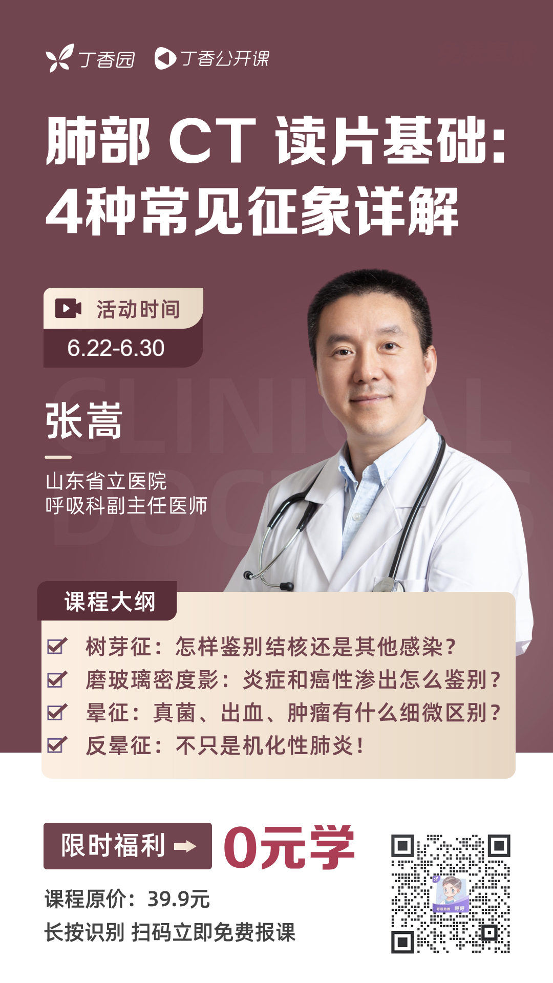 丁香公开课特邀知名讲师 张嵩,共同打造精品课程 《 肺部 CT 读片基础:4 种常见征象详解 》 。