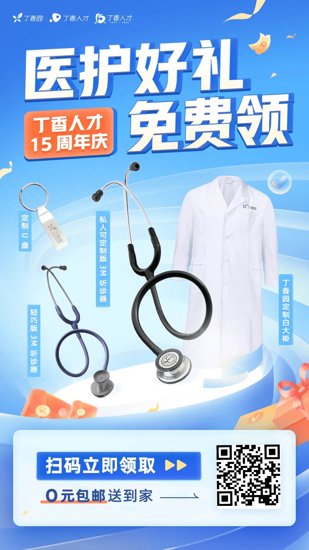根据用户端的喜好,丁香人才推出了定制版的周年庆小礼物,如定制版的 U 盘、3M 听诊器和白大褂,可以让更多医学应届生在投递简历的奔波路上收获不经意的小惊喜。
