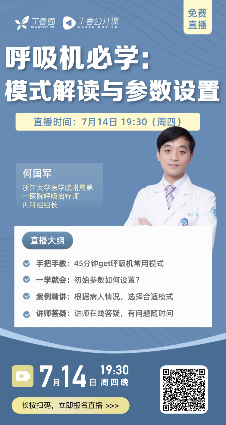 想要快速入门呼吸机,就靠这节直播课啦! 7 月 1 4 日晚 19:30 ,丁香公开课,何国军老师直播间不见不散!