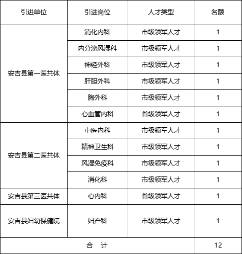 根据安吉县医疗卫生人才引育办法,结合安吉县卫生健康系统实际,安吉县卫健局决定面向全国公开引进高层次医疗卫生人才12名。