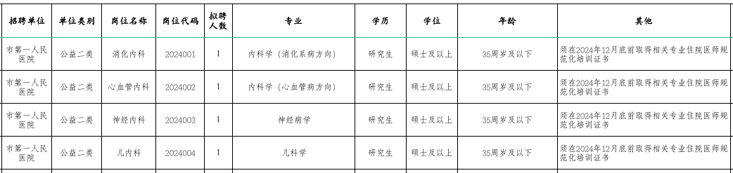 招聘对象为 2024 届具有普通高等院校全日制本科及以上毕业生(包括普通高等院校 2021 届毕业生毕业当年参加面向社会招收的住院医师规范化培训人员)以及符合招聘岗位条件的人员。