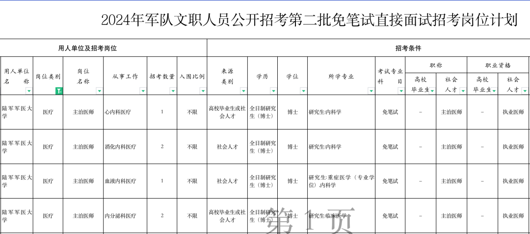 为更好延揽地方优秀人才服务强军事业,根据《军队文职人员公开招考暂行规定》及有关政策规定,中央军委政治工作部将组织 2024 年军队文职人员公开招考第二批免笔试直接面试岗位招考工作: 点击查看完整招聘公告