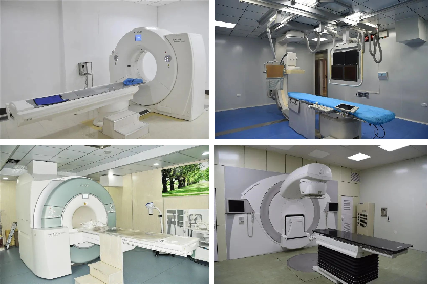 医疗设备实力雄厚,拥有原装进口美国 GE Revolution 512 层超高端螺旋 CT,原装进口瑞典医科达 Synergy 直线加速器、德国西门子 3.0T 磁共振、德国西门子全自动化通用型平板血管造影机、美国柯达数字 X 射线成像设备、意大利全数字化平板乳腺 X 光机等一批高端的诊疗设备。其中磁共振机 3 台,CT 机 3 台,血管造影机 2 台,放疗设备 2 台,彩超 9 台等一批先进诊疗设备。