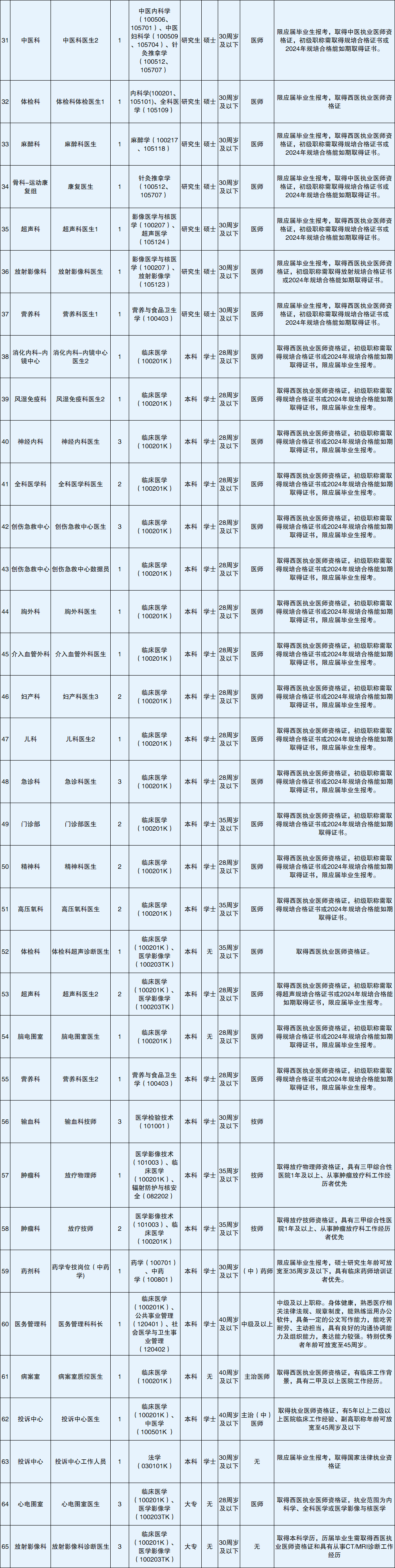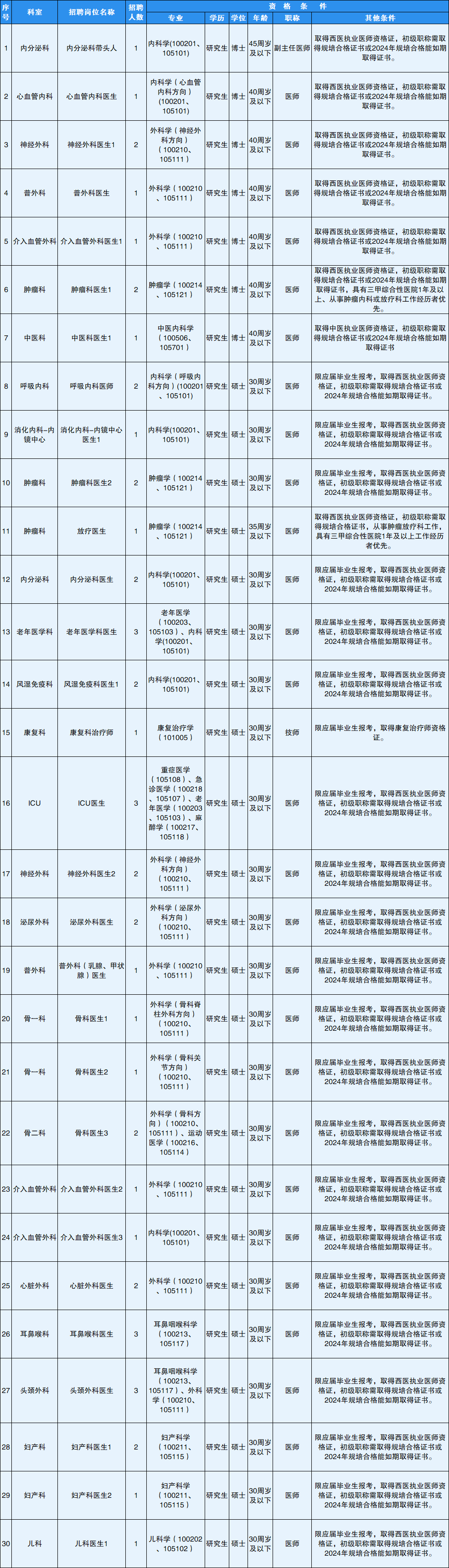各岗位招聘条件详见招聘岗位表有关学历、专业、年龄及其他要求。