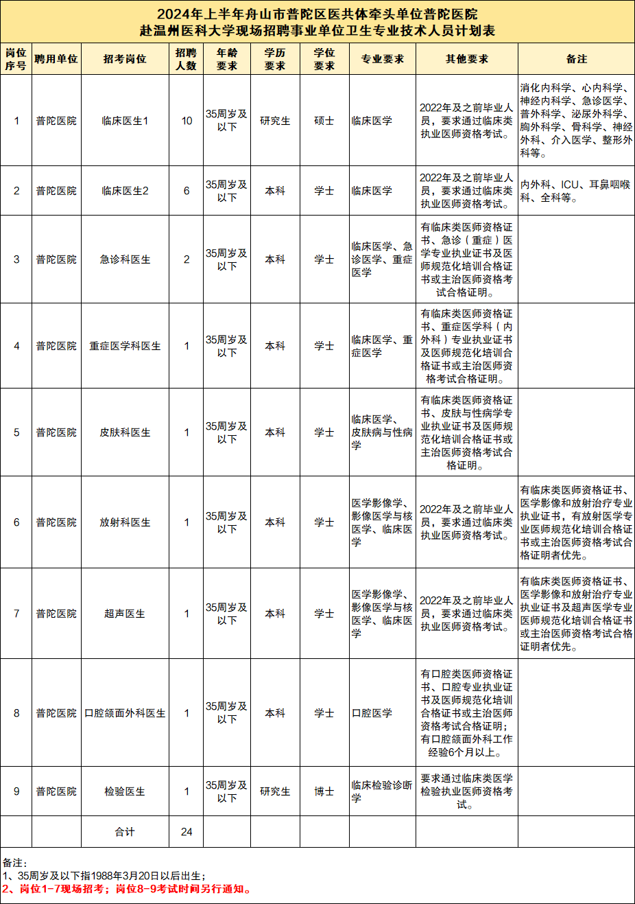 计划招聘医务人员 24 名,具体招聘岗位及计划数详见《2024 年上半年舟山市普陀区医共体牵头单位普陀医院赴温州医科大学现场招聘事业单位卫生专业技术人员计划表》