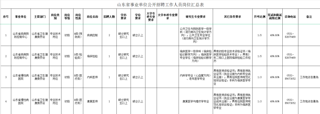 根据事业单位公开招聘有关规定,结合单位岗位空缺情况和工作需要,山东省疾病预防控制中心、山东省慢性病医院等 14 家省属医疗卫生事业单位面向社会公开招聘工作人员,现将有关事项公告如下: