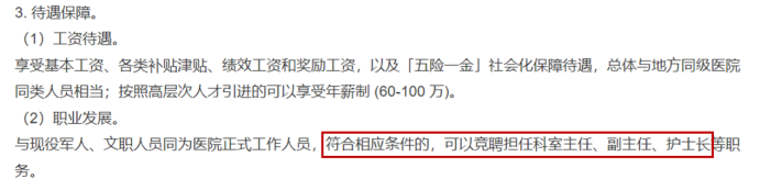 个别部队医院是有试行 聘用科主任制度。因前单位暂没有实行这一制度,不甚了解就不过多赘述。大家找工作时可以仔细了解一下职业发展,避免影响自身职业规划。某部队医院招聘信息就囊括了这一问题,工资待遇和职业发展都一目了然。
