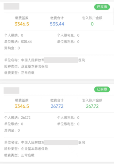 不过,相比与在普通医院工作的同学,部队医院的五险一金会低一点,不知道其他地区的部队医院是否一样,但在我曾任职的医院,五险一金交的是当地的中低水平(图为本人某月养老金缴纳费用)。在意的五险一金的可以在应聘时详细了解一下。
