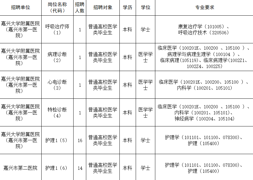 嘉兴大学附属医院 (嘉兴市第一医院) 、嘉兴市第二医院、嘉兴市妇幼保健院、嘉兴市中医医院、嘉兴市康慈医院、嘉兴市疾病预防控制中心、嘉兴市中心血站等 7 家事业单位共计划招聘临床医学、康复治疗学、放射、检验、护理等专业的卫生专业技术人员 103 名。
