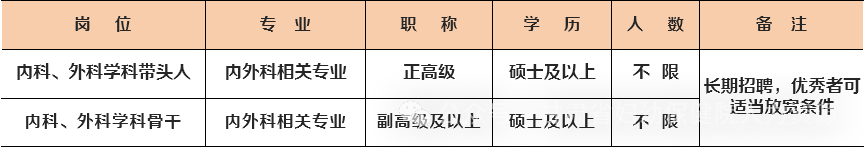 1. 学科带头人:硕士及以上学历学位,正高级职称,具有省级三甲医院工作经验。