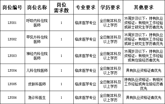 此次面向社会招聘临床医生 6 人,具体要求如下:
